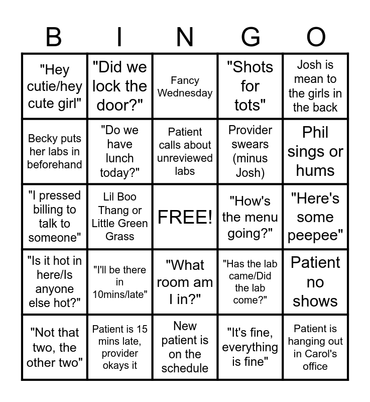 This bingo card has a free space and 24 words: "I'll be there in 10mins/late", Patient is 15 mins late, provider okays it, Patient calls about unreviewed labs, "Not that two, the other two", Josh is mean to the girls in the back, "Hey cutie/hey cute girl", Becky puts her labs in beforehand, "Did we lock the door?", "How's the menu going?", "What room am I in?", Provider swears (minus Josh), "I pressed billing to talk to someone", "Has the lab came/Did the lab come?", Patient no shows, "Do we have lunch today?", "It's fine, everything is fine", "Here's some peepee", Fancy Wednesday, Phil sings or hums, Lil Boo Thang or Little Green Grass, Patient is hanging out in Carol's office, "Is it hot in here/Is anyone else hot?", "Shots for tots" and New patient is on the schedule.