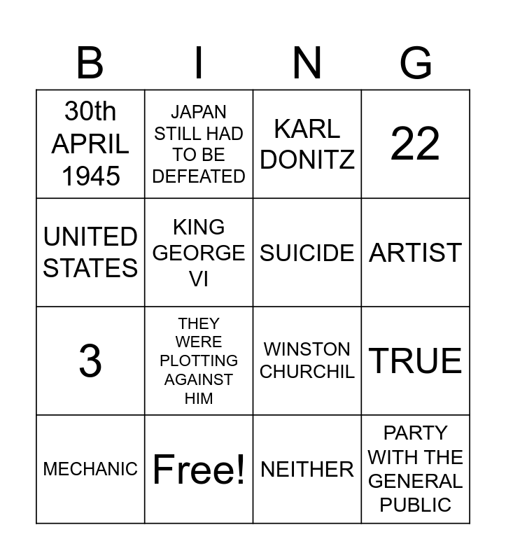 This bingo card has 22 words: Free!, VICTORY IN EUROPE DAY, JAPAN STILL HAD TO BE DEFEATED, 2nd september 1945, KING GEORGE VI, SUICIDE, 30th APRIL 1945, KARL DONITZ, WINSTON CHURCHIL, PARTY WITH THE GENERAL PUBLIC, 3, 22, 12, THE LIBERTY STEAK, NEITHER, JAPAN ATTACKED THEM, TRUE, MECHANIC, THEY WERE PLOTTING AGAINST HIM, UNITED STATES, ARTIST and 8th MAY 1945.