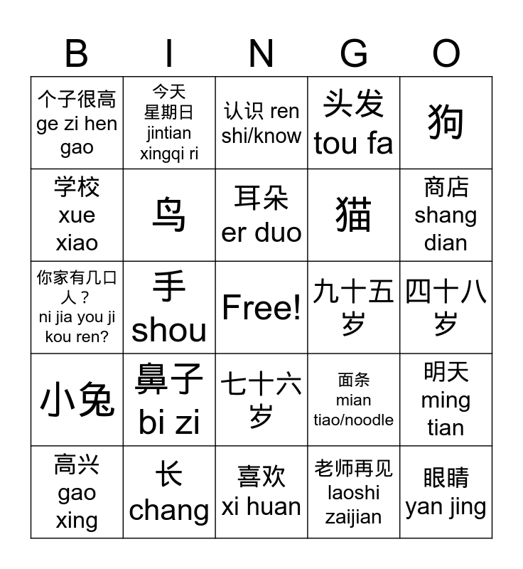 This bingo card has a free space and 24 words: 鼻子 bi zi, 长 chang, 耳朵 er duo, 高兴 gao xing, 狗, 个子很高 ge zi hen gao, 学校 xue xiao, 今天 星期日 jintian xingqi ri, 九十五 岁, 七十六 岁, 猫, 你家有几口人? ni jia you ji kou ren?, 面条 mian tiao/noodle, 明天 ming tian, 鸟, 老师再见 laoshi zaijian, 四十八 岁, 认识 ren shi/know, 商店 shang dian, 手 shou, 眼睛 yan jing, 小兔, 头发 tou fa and 喜欢 xi huan.