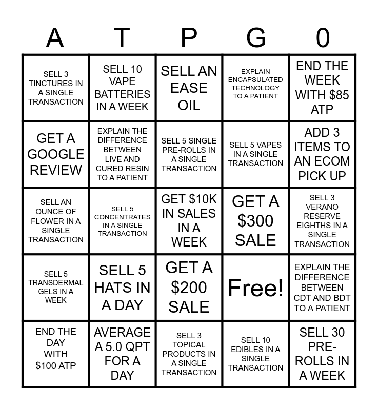 This bingo card has 25 words: SELL 5 HATS IN A DAY, SELL 3 TOPICAL PRODUCTS IN A SINGLE TRANSACTION, SELL 5 SINGLE PRE-ROLLS IN A SINGLE TRANSACTION, END THE DAY WITH $100 ATP, END THE WEEK WITH $85 ATP, SELL 3 TINCTURES IN A SINGLE TRANSACTION, GET A GOOGLE REVIEW, SELL 10 VAPE BATTERIES IN A WEEK, GET A $300 SALE, GET A $200 SALE, SELL 5 VAPES IN A SINGLE TRANSACTION, SELL AN OUNCE OF FLOWER IN A SINGLE TRANSACTION, Free!, EXPLAIN THE DIFFERENCE BETWEEN CDT AND BDT TO A PATIENT, EXPLAIN THE DIFFERENCE BETWEEN LIVE AND CURED RESIN TO A PATIENT, SELL 30 PRE- ROLLS IN A WEEK, SELL 3 VERANO RESERVE EIGHTHS IN A SINGLE TRANSACTION, SELL AN EASE OIL, ADD 3 ITEMS TO AN ECOM PICK UP, SELL 5 CONCENTRATES IN A SINGLE TRANSACTION, GET $10K IN SALES IN A WEEK, AVERAGE A 5.0 QPT FOR A DAY, SELL 5 TRANSDERMAL GELS IN A WEEK, EXPLAIN ENCAPSULATED TECHNOLOGY TO A PATIENT and SELL 10 EDIBLES IN A SINGLE TRANSACTION.