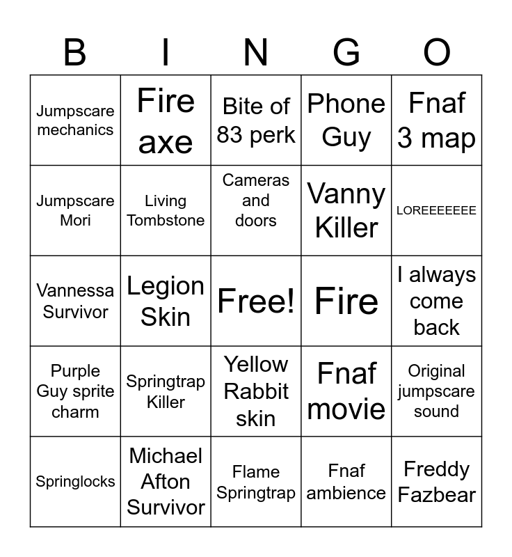 This bingo card has a free space and 24 words: Springtrap Killer, Michael Afton Survivor, Cameras and doors, Springlocks, Fnaf 3 map, Jumpscare mechanics, Jumpscare Mori, Fire axe, Fire, Yellow Rabbit skin, Vanny Killer, Vannessa Survivor, Fnaf movie, Original jumpscare sound, Living Tombstone, Fnaf ambience, I always come back, Bite of 83 perk, LOREEEEEEE, Legion Skin, Freddy Fazbear, Purple Guy sprite charm, Phone Guy and Flame Springtrap.