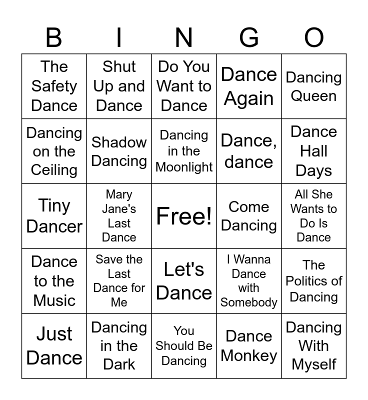This bingo card has a free space and 26 words: Let's Dance, Dance Monkey, Dancing in the Moonlight, Dancing in the Dark, Dancing Queen, The Safety Dance, Dancing on the Ceiling, Shut Up and Dance, All She Wants to Do Is Dance, I Wanna Dance with Somebody, Dance, dance, Tiny Dancer, The Politics of Dancing, Just Dance, Mary Jane's Last Dance, Last Dance, Dance Again, Dance to the Music, Do You Want to Dance, Dancing With Myself, Dance Hall Days, You Should Be Dancing, Come Dancing, Save the Last Dance for Me, Shadow Dancing and I Can't Dance.