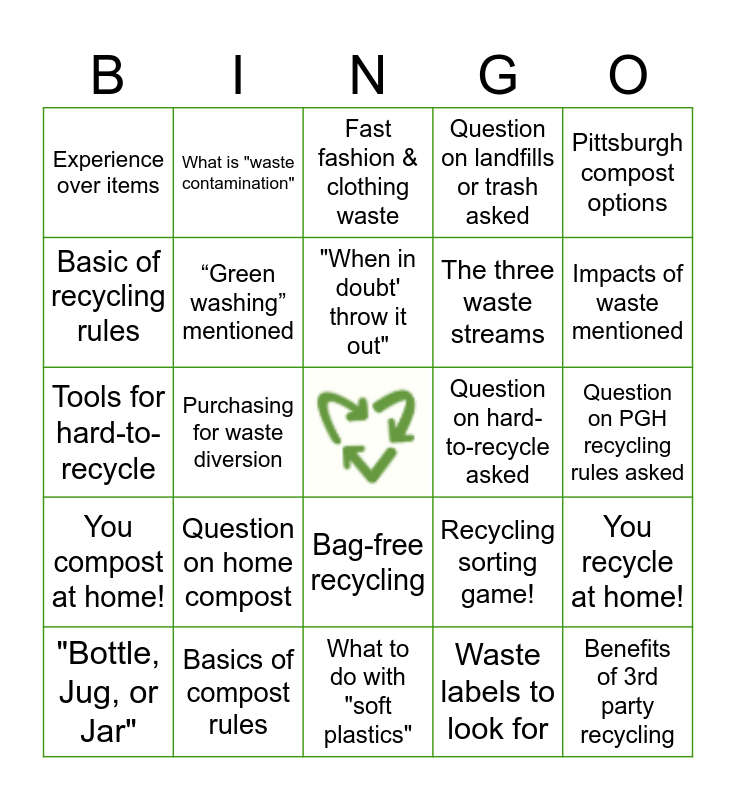 This bingo card has a free space and 24 words: Question on home compost, Basics of compost rules, "When in doubt' throw it out", "Bottle, Jug, or Jar", Pittsburgh compost options, Experience over items, Basic of recycling rules, What is "waste contamination", Question on hard-to-recycle asked, Bag-free recycling, The three waste streams, Tools for hard-to-recycle, Recycling sorting game!, You recycle at home!, “Green washing” mentioned, Waste labels to look for, Question on PGH recycling rules asked, Fast fashion & clothing waste, Impacts of waste mentioned, Purchasing for waste diversion, Benefits of 3rd party recycling, You compost at home!, Question on landfills or trash asked and What to do with "soft plastics".