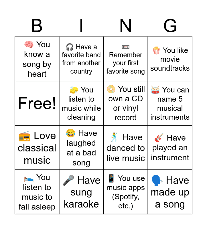 This bingo card has 16 words: 🎤 Have sung karaoke, 🎸 Have played an instrument, 📼 Remember your first favorite song, 🧠 You know a song by heart, 📻 Love classical music, 🎧 Have a favorite band from another country, 🕺 Have danced to live music, 📱 You use music apps (Spotify, etc.), Free!, 🧽 You listen to music while cleaning, 🛌 You listen to music to fall asleep, 🍿 You like movie soundtracks, 😂 Have laughed at a bad song, 🥁 You can name 5 musical instruments, 📀 You still own a CD or vinyl record and 🗣️ Have made up a song.