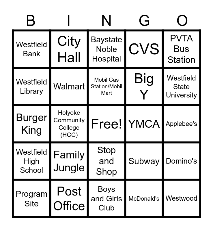 This bingo card has a free space and 24 words: Family Jungle, Post Office, Mobil Gas Station/Mobil Mart, Program Site, PVTA Bus Station, Westfield Bank, Westfield Library, City Hall, YMCA, Stop and Shop, Big Y, Burger King, Subway, Domino's, Walmart, McDonald's, Applebee's, Baystate Noble Hospital, Westfield State University, Holyoke Community College (HCC), Westwood, Westfield High School, CVS and Boys and Girls Club.