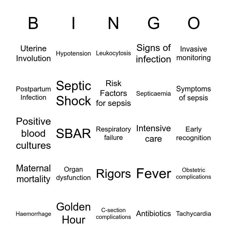 This bingo card has a free space and 24 words: Organ dysfunction, Golden Hour, Risk Factors for sepsis, Haemorrhage, Invasive monitoring, Uterine Involution, Postpartum Infection, Hypotension, Intensive care, Rigors, Septicaemia, Positive blood cultures, Fever, Obstetric complications, Septic Shock, Antibiotics, Early recognition, Leukocytosis, Symptoms of sepsis, SBAR, Tachycardia, Maternal mortality, Signs of infection and C-section complications.