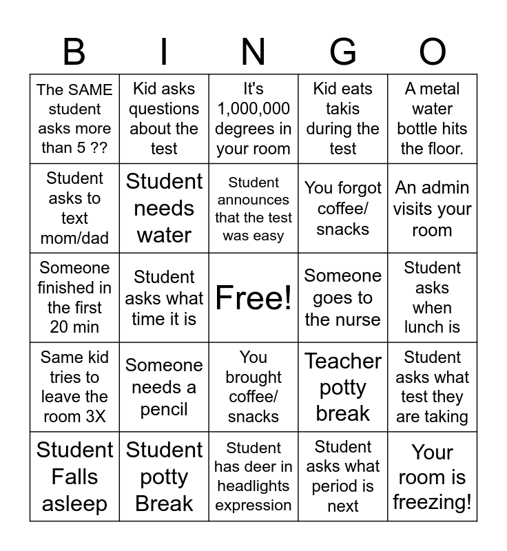 This bingo card has a free space and 24 words: Student Falls asleep, Someone needs a pencil, Student announces that the test was easy, Student asks what period is next, A metal water bottle hits the floor., The SAME student asks more than 5 ??, Kid asks questions about the test, It's 1,000,000 degrees in your room, Someone goes to the nurse, Student asks when lunch is, Someone finished in the first 20 min, Student needs water, Teacher potty break, Student asks what test they are taking, Student asks to text mom/dad, Student potty Break, Student has deer in headlights expression, Kid eats takis during the test, An admin visits your room, Same kid tries to leave the room 3X, Student asks what time it is, You brought coffee/ snacks, You forgot coffee/ snacks and Your room is freezing!.