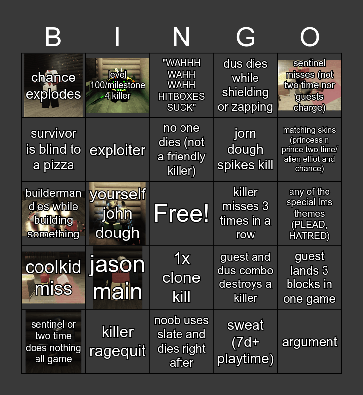 This bingo card has 8 images, a free space and 24 words: jason main, killer ragequit, no one dies (not a friendly killer), sentinel or two time does nothing all game, sentinel misses (not two time nor guests charge), chance explodes, survivor is blind to a pizza, level 100/milestone 4 killer, killer misses 3 times in a row, 1x clone kill, jorn dough spikes kill, builderman dies while building something, guest and dus combo destroys a killer, guest lands 3 blocks in one game, exploiter, sweat (7d+ playtime), any of the special lms themes (PLEAD, HATRED), "WAHHH WAHH WAHH HITBOXES SUCK", matching skins (princess n prince two time/ alien elliot and chance), yourself john dough, argument, coolkid miss, dus dies while shielding or zapping and noob uses slate and dies right after.