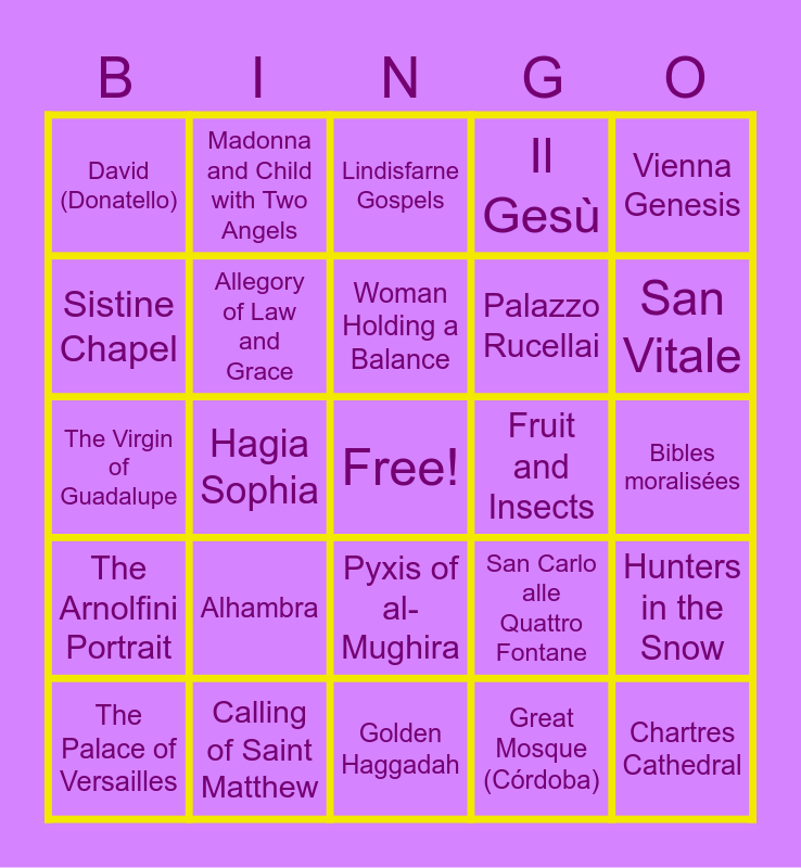 This bingo card has a free space and 50 words: Catacomb of Priscilla, Chartres Cathedral, Arena (Scrovegni) Chapel, Golden Haggadah, Alhambra, Annunciation Triptych, Madonna and Child with Two Angels, Birth of Venus, Sistine Chapel, Entombment of Christ, Allegory of Law and Grace, Il Gesù, Hunters in the Snow, San Carlo alle Quattro Fontane, Ecstasy of Saint Teresa, Las Meninas, Woman Holding a Balance, Fruit and Insects, Santa Sabina, Vienna Genesis, Hagia Sophia, Great Mosque (Córdoba), David (Donatello), Palazzo Rucellai, Adam and Eve, Angel with Arquebus, San Vitale, Merovingian looped fibulae, Lindisfarne Gospels, Pyxis of al-Mughira, Bayeux Tapestry, Pazzi Chapel, School of Athens, Venus of Urbino, Calling of Saint Matthew, Self-Portrait with Saskia, Screen with the Siege of Belgrade and Hunting Scene, Virgin (Theotokos) and Child between Saints Theodore and George, Church of Sainte-foy, Bibles moralisées, Röttgen Pietà, The Last Supper, Isenheim altarpiece, Henri IV Receives the Portrait of Marie de’Medici, The Palace of Versailles, The Virgin of Guadalupe, Spaniard and Indian Produce a Mestizo, The Tête à Tête, from Marriage à la Mode, The Arnolfini Portrait and Frontispiece of the Codex Mendoza.