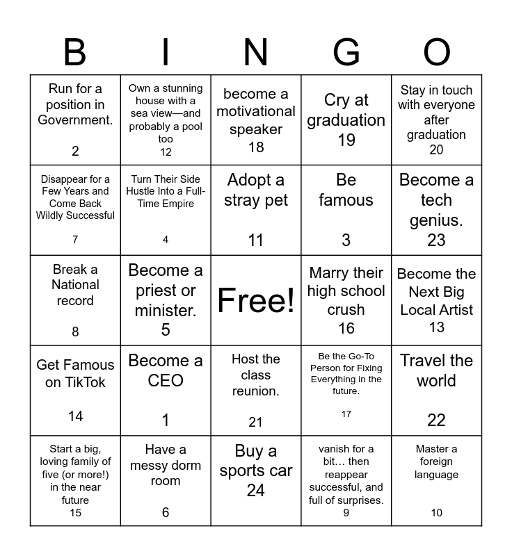 This bingo card has a free space and 24 words: Become a CEO 1, Have a messy dorm room 6, Adopt a stray pet 11, Start a big, loving family of five (or more!) in the near future 15, Stay in touch with everyone after graduation 20, Run for a position in Government. 2, Disappear for a Few Years and Come Back Wildly Successful 7, Own a stunning house with a sea view—and probably a pool too 12, Marry their high school crush 16, Host the class reunion. 21, Be famous 3, Break a National record 8, Be the Go-To Person for Fixing Everything in the future. 17, Travel the world 22, Turn Their Side Hustle Into a Full-Time Empire 4, vanish for a bit… then reappear successful, and full of surprises. 9, Become the Next Big Local Artist 13, become a motivational speaker 18, Become a tech genius. 23, Become a priest or minister. 5, Master a foreign language 10, Get Famous on TikTok 14, Cry at graduation 19 and Buy a sports car 24.