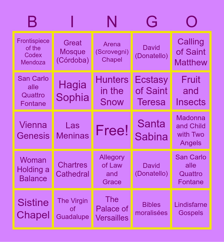 This bingo card has a free space and 74 words: Catacomb of Priscilla, Chartres Cathedral, Arena (Scrovegni) Chapel, Golden Haggadah, Alhambra, Annunciation Triptych, Madonna and Child with Two Angels, Birth of Venus, Sistine Chapel, Entombment of Christ, Allegory of Law and Grace, Il Gesù, Hunters in the Snow, San Carlo alle Quattro Fontane, Ecstasy of Saint Teresa, Las Meninas, Woman Holding a Balance, Fruit and Insects, Santa Sabina, Vienna Genesis, Hagia Sophia, Great Mosque (Córdoba), David (Donatello), Palazzo Rucellai, Lindisfarne Gospels, Pyxis of al-Mughira, Bayeux Tapestry, Pazzi Chapel, School of Athens, Venus of Urbino, Calling of Saint Matthew, Self-Portrait with Saskia, Screen with the Siege of Belgrade and Hunting Scene, Virgin (Theotokos) and Child between Saints Theodore and George, Church of Sainte-foy, Bibles moralisées, Röttgen Pietà, The Last Supper, Isenheim altarpiece, Henri IV Receives the Portrait of Marie de’Medici, The Palace of Versailles, The Virgin of Guadalupe, Spaniard and Indian Produce a Mestizo, The Tête à Tête, from Marriage à la Mode, The Arnolfini Portrait, Frontispiece of the Codex Mendoza, Catacomb of Priscilla, Chartres Cathedral, Arena (Scrovegni) Chapel, Golden Haggadah, Alhambra, Annunciation Triptych, Madonna and Child with Two Angels, Birth of Venus, Sistine Chapel, Entombment of Christ, Allegory of Law and Grace, Il Gesù, Hunters in the Snow, San Carlo alle Quattro Fontane, Ecstasy of Saint Teresa, Las Meninas, Woman Holding a Balance, Fruit and Insects, Santa Sabina, Vienna Genesis, Hagia Sophia, Great Mosque (Córdoba), David (Donatello), Palazzo Rucellai, Adam and Eve, Angel with Arquebus, San Vitale and Merovingian looped fibulae.