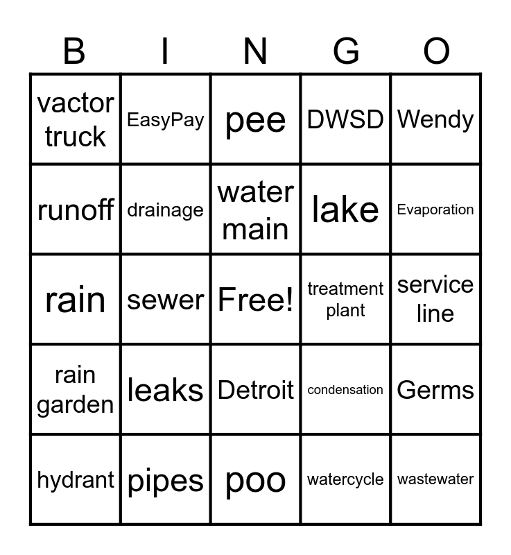 This bingo card has a free space and 29 words: hydrant, water, sewer, catch basin, vactor truck, pee, drainage, leaks, treatment plant, pipes, service line, wastewater, poo, watercycle, Evaporation, toiletpaper, Detroit, rain garden, Wendy, rain, condensation, precipitation, lake, runoff, DWSD, EasyPay, Germs, water main and flood.