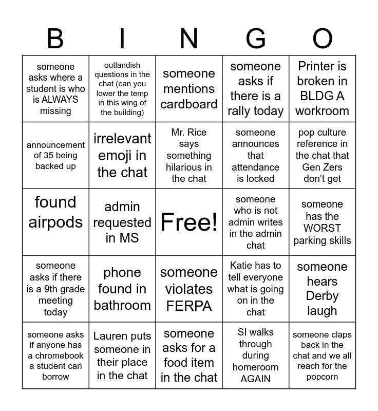 This bingo card has a free space and 24 words: someone asks if anyone has a chromebook a student can borrow, phone found in bathroom, Mr. Rice says something hilarious in the chat, SI walks through during homeroom AGAIN, Printer is broken in BLDG A workroom, someone asks where a student is who is ALWAYS missing, outlandish questions in the chat (can you lower the temp in this wing of the building), someone mentions cardboard, someone who is not admin writes in the admin chat, someone has the WORST parking skills, found airpods, irrelevant emoji in the chat, Katie has to tell everyone what is going on in the chat, someone hears Derby laugh, announcement of 35 being backed up, Lauren puts someone in their place in the chat, someone asks for a food item in the chat, someone asks if there is a rally today, pop culture reference in the chat that Gen Zers don’t get, someone asks if there is a 9th grade meeting today, admin requested in MS, someone violates FERPA, someone announces that attendance is locked and someone claps back in the chat and we all reach for the popcorn.