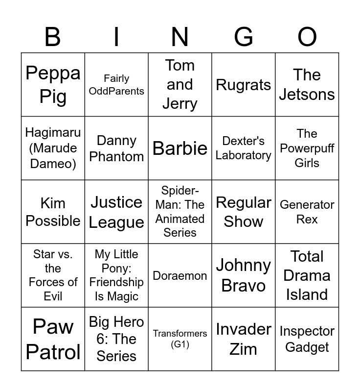 This bingo card has 75 words: SpongeBob SquarePants, Looney Tunes, Tom and Jerry, The Simpsons, Scooby-Doo, Where Are You!, Adventure Time, Family Guy, Rick and Morty, Futurama, Avatar: The Last Airbender, Inspector Gadget, Gravity Falls, Barbie, Hagimaru (Marude Dameo), Batman: The Animated Series, Justice League, X-Men: The Animated Series, Spider-Man: The Animated Series, The Flintstones, The Jetsons, Phineas and Ferb, Kim Possible, Danny Phantom, Fairly OddParents, Rugrats, Hey Arnold!, Doug, Shinchan, American Dad!, The Boondocks, King of the Hill, Courage the Cowardly Dog, Ed, Edd n Eddy, Johnny Bravo, The Powerpuff Girls, Dexter's Laboratory, Samurai Jack, Ben 10, Generator Rex, Invader Zim, Animaniacs, Pinky and the Brain, Tiny Toon Adventures, Arthur, South Park, Bluey, Paw Patrol, Peppa Pig, Caillou, The Magic School Bus, Clifford the Big Red Dog, Doraemon, Dragon Ball Z, Naruto, One Piece, Pokémon, Digimon, Sailor Moon, Beyblade, Yu-Gi-Oh!, My Little Pony: Friendship Is Magic, Winx Club, Steven Universe, Clarence, The Amazing World of Gumball, Regular Show, Chowder, Camp Lazlo, Foster’s Home for Imaginary Friends, Total Drama Island, Star vs. the Forces of Evil, Big Hero 6: The Series, Miraculous: Tales of Ladybug & Cat Noir, Transformers (G1) and Voltron: Legendary Defender.