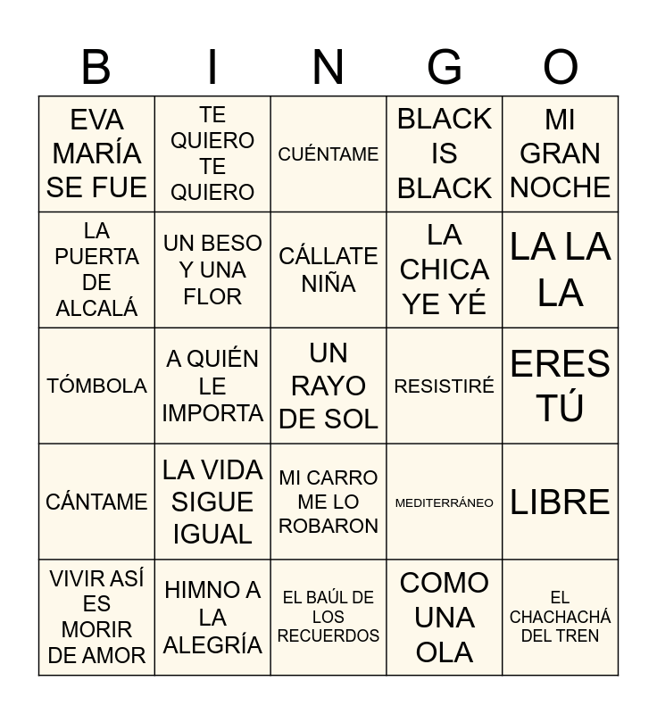 This bingo card has a free space and 24 words: LA VIDA SIGUE IGUAL, HIMNO A LA ALEGRÍA, CÁLLATE NIÑA, VIVIR ASÍ ES MORIR DE AMOR, MI GRAN NOCHE, EVA MARÍA SE FUE, LA PUERTA DE ALCALÁ, TE QUIERO TE QUIERO, RESISTIRÉ, MI CARRO ME LO ROBARON, LA CHICA YE YÉ, TÓMBOLA, MEDITERRÁNEO, LIBRE, UN BESO Y UNA FLOR, COMO UNA OLA, ERES TÚ, CUÉNTAME, LA LA LA, A QUIÉN LE IMPORTA, EL CHACHACHÁ DEL TREN, CÁNTAME, BLACK IS BLACK and EL BAÚL DE LOS RECUERDOS.