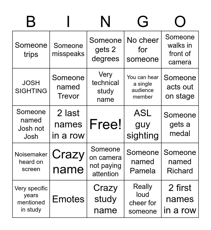 This bingo card has a free space and 25 words: Crazy name, Crazy study name, Very technical study name, Very specific years mentioned in study, Someone walks in front of camera, Someone trips, JOSH SIGHTING, Someone misspeaks, ASL guy sighting, Someone on camera not paying attention, You can hear a single audience member, Someone named Josh not Josh, Someone named Pamela, Someone named Richard, Someone named Trevor, Someone named Lindsay, Someone gets a medal, Someone gets 2 degrees, Someone acts out on stage, 2 last names in a row, 2 first names in a row, Emotes, Noisemaker heard on screen, No cheer for someone and Really loud cheer for someone.