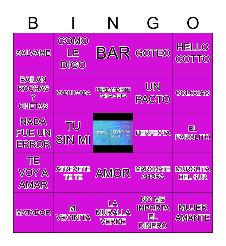 This bingo card has a free space and 24 words: ATREVETE TE TE, MI VECINITA, PERDONARTE PARA QUE?, MATADOR, HELLO COTTO, SALVAME, BAILAN ROCHAS Y CHETAS, COMO LE DIGO, PERFECTA, AMOR, UN PACTO, NADA FUE UN ERROR, MARCHATE AHORA, MURGUITA DEL SUR, MADRUGADA, NO ME IMPORTA EL DINERO, EL FAROLITO, BAR, COLOCAO, TU SIN MI, MUJER AMANTE, TE VOY A AMAR, GOTEO and LA MURALLA VERDE.