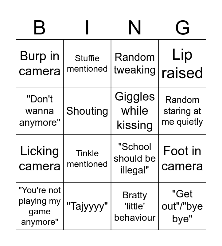 This bingo card has 16 words: "Tajyyyy", Foot in camera, Random tweaking, Burp in camera, Licking camera, Stuffie mentioned, "School should be illegal", Bratty 'little' behaviour, "Don't wanna anymore", Shouting, "You're not playing my game anymore", Lip raised, Tinkle mentioned, Random staring at me quietly, Giggles while kissing and "Get out"/"bye bye".