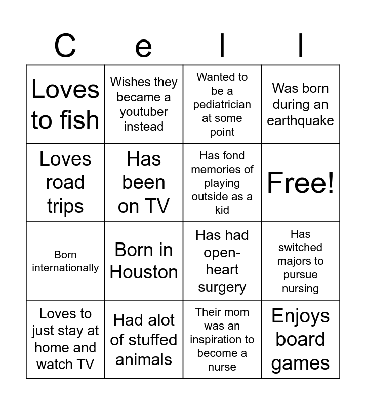 This bingo card has 18 words: Born in Houston, Enjoys board games, Wanted to be a pediatrician at some point, Loves to fish, Has had open-heart surgery, Was born during an earthquake, Loves to just stay at home and watch TV, Wishes they became a youtuber instead, Free!, Born internationally, Their mom was an inspiration to become a nurse, Loves road trips, Has switched majors to pursue nursing, Has been on TV, Has fond memories of playing outside as a kid, Prank calls, Had alot of stuffed animals and Has been to more than 5 states.