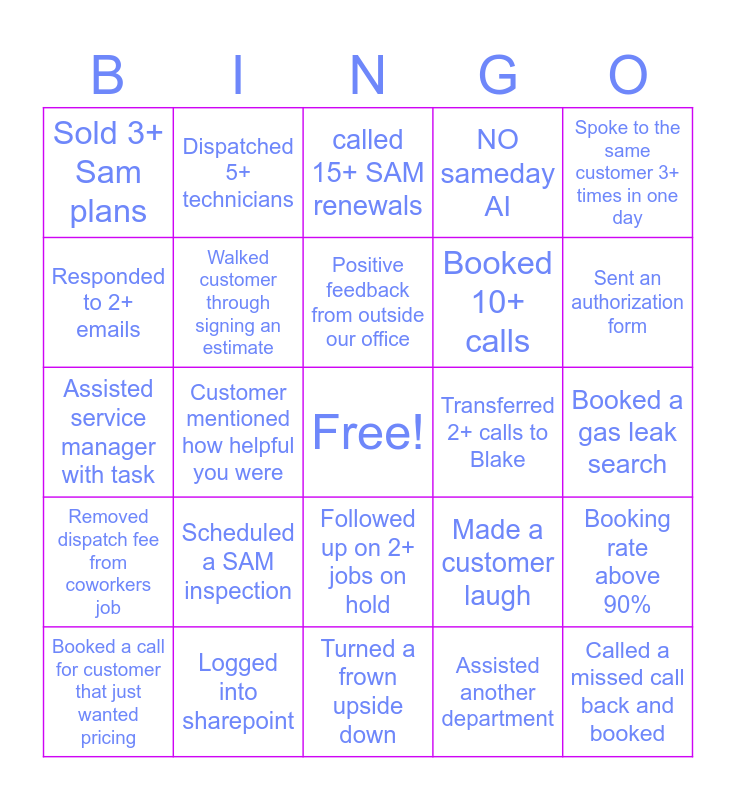 This bingo card has a free space and 29 words: Booked a call for customer that just wanted pricing, Used customer name on 4+ calls, Customer mentioned how helpful you were, Booked 15+ calls, Sold 3+ Sam plans, called 15+ SAM renewals, Walked customer through signing an estimate, Scheduled a SAM inspection, Transferred 2+ calls to Blake, Logged into sharepoint, Booked a gas leak search, Called a missed call back and booked, Turned a frown upside down, Assisted another department, Sent an authorization form, Booked a job from a form submission, Followed up on 2+ jobs on hold, Removed dispatch fee from coworkers job, Spoke to the same customer 3+ times in one day, Assisted service manager with task, Made a customer laugh, Learned something new today, Booked 10+ calls, Responded to 2+ emails, NO sameday AI, Dispatched 5+ technicians, Booking rate above 90%, Positive feedback from outside our office and Made 10+ happy calls.