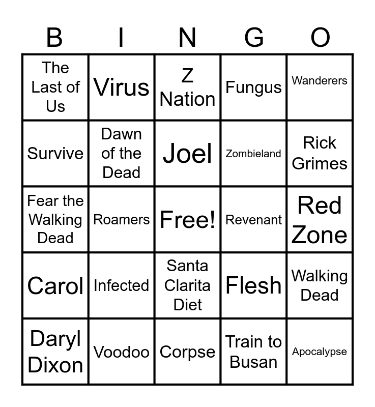 This bingo card has a free space and 49 words: Undead, Apocalypse, Horror, Corpse, Infected, Living Dead, Virus, Plague, Survive, Slow, Dawn of the Dead, Fungus, Walking Dead, Flesh, Infection, Bite, Joel, Revenant, 28 Days Later, Wanderers, Roamers, Train to Busan, The Last of Us, Zombieland, World War Z, Rick Grimes, Daryl Dixon, Negan, Santa Clarita Diet, Carol, Lab leak, Radiation, Bioweapon, Toxic, Voodoo, Disease, Walker, Zero Hour, Red Zone, Deadhead, Machete, Contaminated, Safehouse, Mutation, Fear the Walking Dead, Z Nation, 28 Weeks Later, Runner and Michonne.