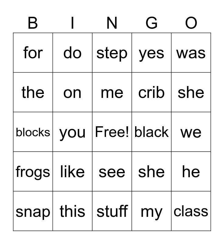 This bingo card has a free space and 29 words: snap, flip, you, truck, for, step, on, like, black, this, we, class, stuff, my, she, now, see, frogs, was, blocks, she, drop, crib, the, yes, do, he, me and smell.
