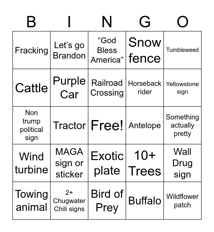 This bingo card has a free space and 24 words: MAGA sign or sticker, 2+ Chugwater Chili signs, Railroad Crossing, Towing animal, Tumbleweed, Fracking, Cattle, Let’s go Brandon, Antelope, Exotic plate, Horseback rider, Non trump political sign, 10+ Trees, Wall Drug sign, Purple Car, Buffalo, Something actually pretty, “God Bless America”, Yellowstone sign, Tractor, Wildflower patch, Wind turbine, Snow fence and Bird of Prey.