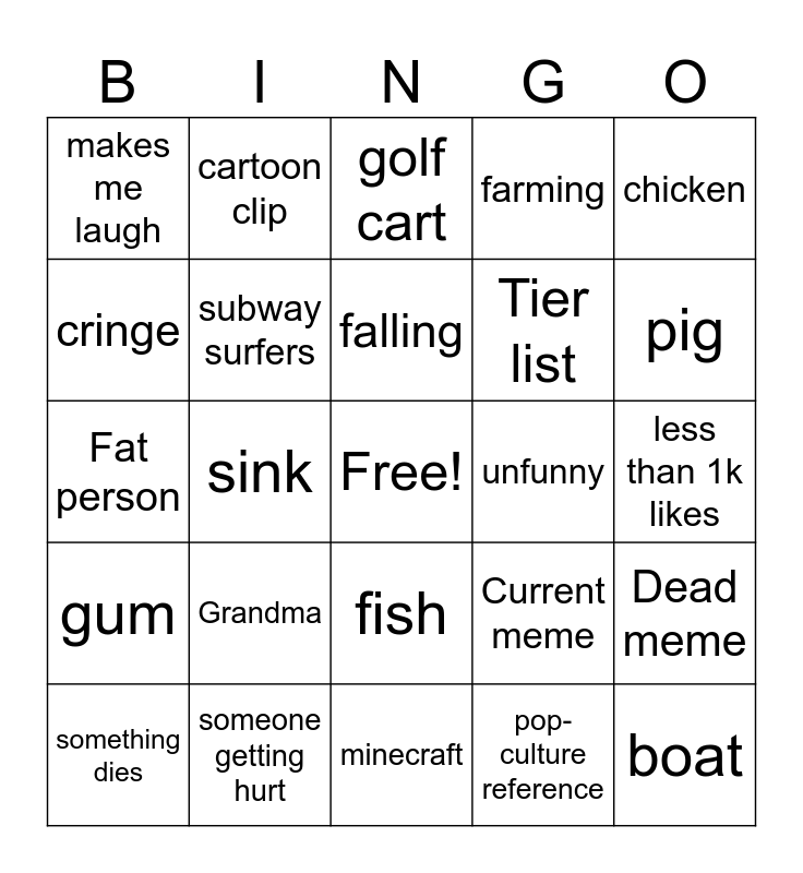 This bingo card has a free space and 24 words: Grandma, someone getting hurt, falling, something dies, chicken, makes me laugh, cringe, cartoon clip, unfunny, fish, Tier list, Fat person, Current meme, Dead meme, subway surfers, pop-culture reference, less than 1k likes, golf cart, pig, sink, boat, gum, farming and minecraft.