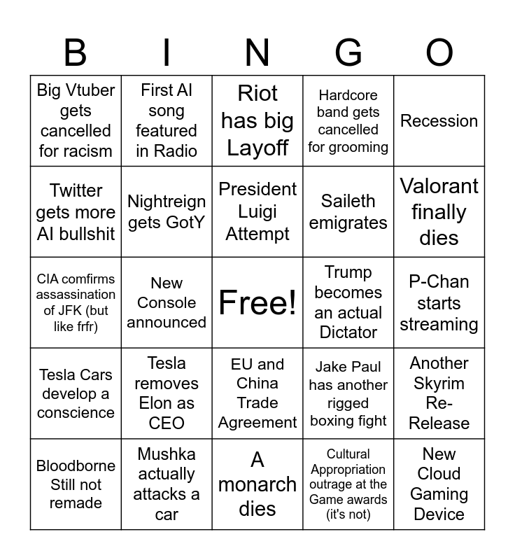 This bingo card has a free space and 24 words: Tesla removes Elon as CEO, Mushka actually attacks a car, President Luigi Attempt, Bloodborne Still not remade, Recession, Big Vtuber gets cancelled for racism, Twitter gets more AI bullshit, First AI song featured in Radio, Trump becomes an actual Dictator, EU and China Trade Agreement, Saileth emigrates, CIA comfirms assassination of JFK (but like frfr), Jake Paul has another rigged boxing fight, Another Skyrim Re-Release, Nightreign gets GotY, Cultural Appropriation outrage at the Game awards (it's not), P-Chan starts streaming, Riot has big Layoff, Valorant finally dies, New Console announced, New Cloud Gaming Device, Tesla Cars develop a conscience, Hardcore band gets cancelled for grooming and A monarch dies.