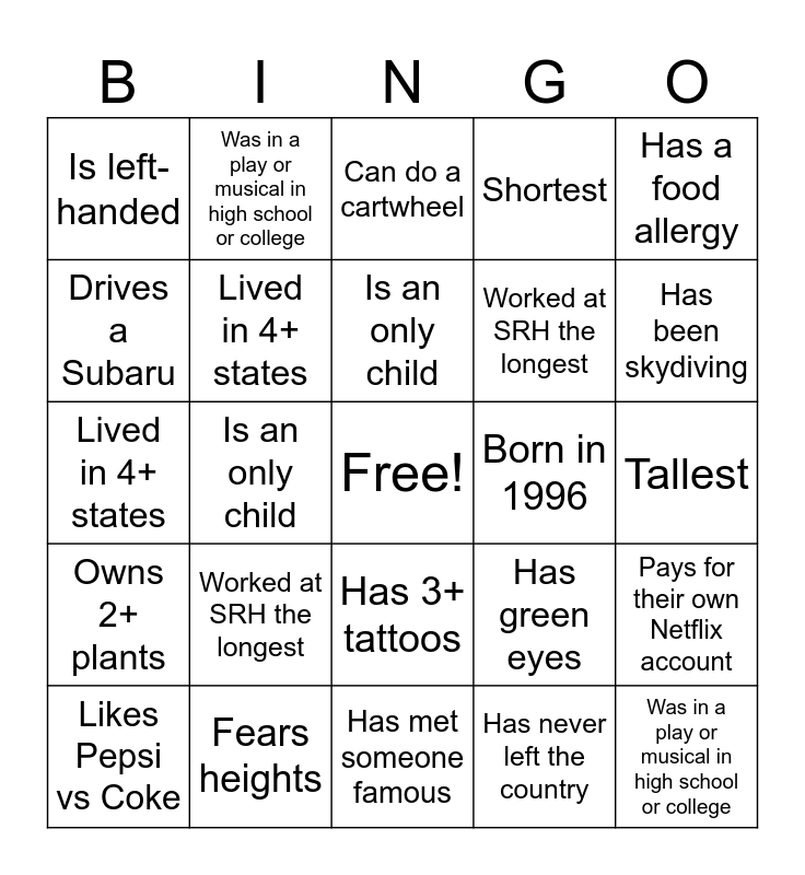 This bingo card has a free space and 60 words: Played a sport in college, Fears heights, Doesn’t drink coffee, Owns 2+ plants, Has never left the country, Plays an instrument, Lived in 4+ states, Visited 5+ countries, Worked at SRH the longest, Tallest, Shortest, Has green eyes, Drives a Subaru, Has a dog, Has a cat, Is left-handed, Was in a play or musical in high school or college, Has a food allergy, Speaks 2+ languages, Is an only child, Born in 1996, Can do a cartwheel, Likes Pepsi vs Coke, Pays for their own Netflix account, Read more than 2 books this year, Has 3+ tattoos, Has met someone famous, Is the oldest sibling, Has been skydiving, Has broken a bone, Drives a Subaru, Has a dog, Has a cat, Is left-handed, Was in a play or musical in high school or college, Has a food allergy, Speaks 2+ languages, Is an only child, Born in 1996, Lived in 4+ states, Visited 5+ countries, Worked at SRH the longest, Tallest, Shortest, Has green eyes, Can do a cartwheel, Likes Pepsi vs Coke, Pays for their own Netflix account, Read more than 2 books this year, Has 3+ tattoos, Has met someone famous, Is the oldest sibling, Has been skydiving, Has broken a bone, Played a sport in college, Fears heights, Doesn’t drink coffee, Owns 2+ plants, Has never left the country and Plays an instrument.