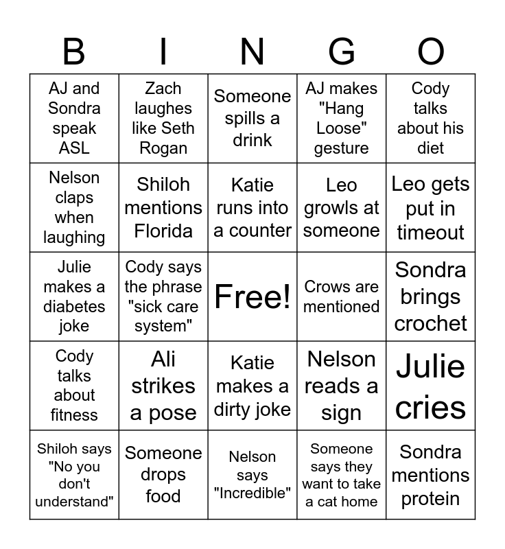 This bingo card has a free space and 39 words: Thomas sits on his own, Thomas talks about painting figures, Shiloh says something unhinged, Shiloh mentions Florida, Shiloh says "No you don't understand", Katie makes a dirty joke, Katie runs into a counter, Katie stumbles over something, Cody talks about his diet, Cody talks about fitness, Cody says the phrase "sick care system", AJ makes "Hang Loose" gesture, Sondra mentions protein, Sondra brings crochet, Crows are mentioned, Ali strikes a pose, Ali doesn't understand, AJ and Sondra speak ASL, Someone compliments Ali's outfit, Nelson reads a sign, Nelson claps when laughing, Nelson says "Incredible", Leo growls at someone, Leo gets put in timeout, Brenna loses her phone, Brenna forgets where she left her drink, Brenna cracks her knuckles, Brenna talks with her hands, Brenna mentions being neurodivergent, Zach laughes like Seth Rogan, Zach mentiones Miluakee tools, Zach mentions Wisonsin, Someone spills a drink, Someone drops food, Someone says they want to take a cat home, Julie snorts, Julie cries, Julie makes a diabetes joke and Julie says she hates surprises.