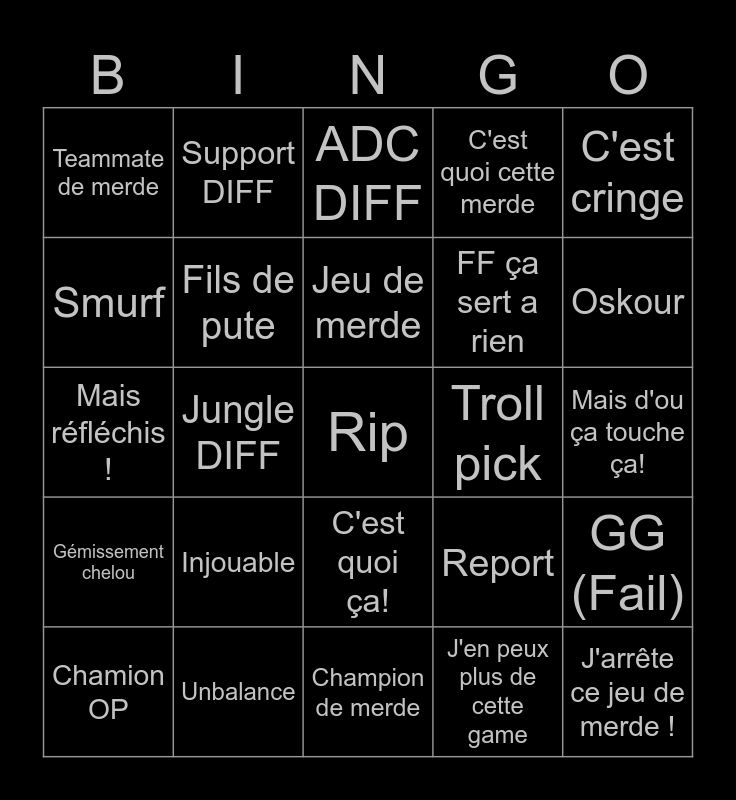 This bingo card has a free space and 24 words: Injouable, Unbalance, Jeu de merde, Chamion OP, C'est cringe, Teammate de merde, Smurf, Support DIFF, Troll pick, C'est quoi ça!, FF ça sert a rien, Mais réfléchis !, Report, GG (Fail), Fils de pute, J'en peux plus de cette game, Mais d'ou ça touche ça!, ADC DIFF, Oskour, Jungle DIFF, J'arrête ce jeu de merde !, Gémissement chelou, C'est quoi cette merde and Champion de merde.