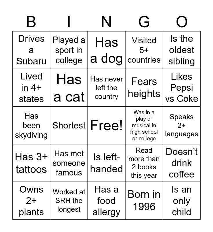 This bingo card has a free space and 30 words: Worked at SRH the longest, Tallest, Shortest, Has green eyes, Drives a Subaru, Has a dog, Has a cat, Is left-handed, Was in a play or musical in high school or college, Has a food allergy, Speaks 2+ languages, Is an only child, Born in 1996, Can do a cartwheel, Likes Pepsi vs Coke, Pays for their own Netflix account, Read more than 2 books this year, Has 3+ tattoos, Has met someone famous, Is the oldest sibling, Has been skydiving, Has broken a bone, Played a sport in college, Fears heights, Lived in 4+ states, Visited 5+ countries, Doesn’t drink coffee, Owns 2+ plants, Has never left the country and Plays an instrument.