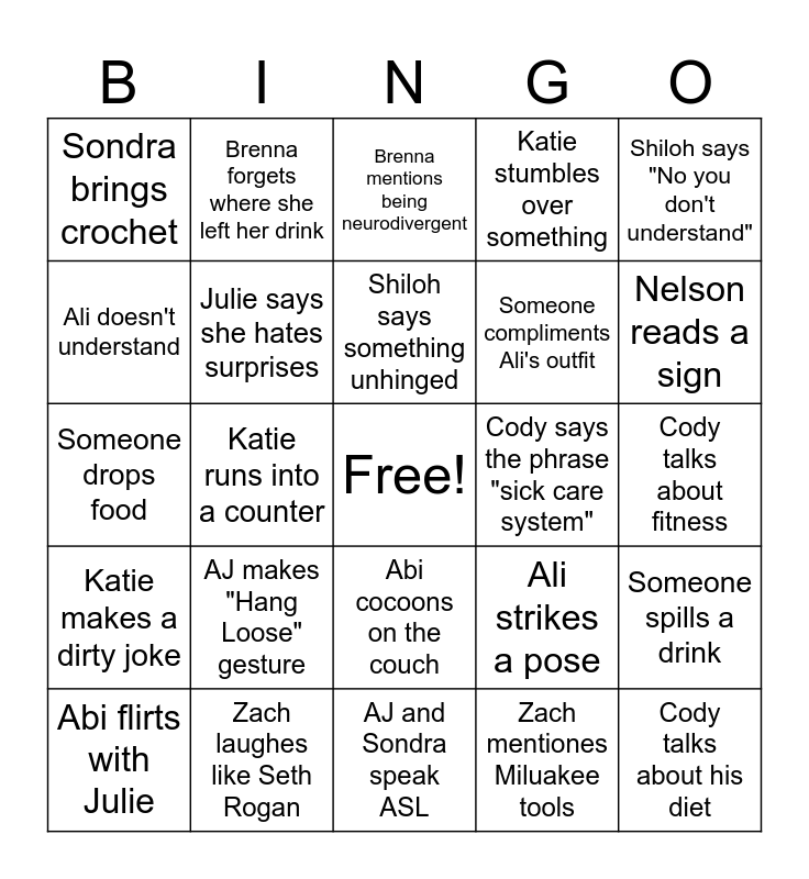 This bingo card has a free space and 39 words: Julie snorts, Julie cries, Julie makes a diabetes joke, Julie says she hates surprises, Abi flirts with Julie, Abi cocoons on the couch, Shiloh says something unhinged, Shiloh mentions Florida, Shiloh says "No you don't understand", Katie makes a dirty joke, Katie runs into a counter, Katie stumbles over something, Cody talks about his diet, Cody talks about fitness, Cody says the phrase "sick care system", AJ makes "Hang Loose" gesture, Sondra mentions protein, Sondra brings crochet, Crows are mentioned, Ali strikes a pose, Ali doesn't understand, AJ and Sondra speak ASL, Someone compliments Ali's outfit, Nelson reads a sign, Nelson claps when laughing, Nelson says "Incredible", Leo growls at someone, Leo gets put in timeout, Brenna loses her phone, Brenna forgets where she left her drink, Brenna cracks her knuckles, Brenna talks with her hands, Brenna mentions being neurodivergent, Zach laughes like Seth Rogan, Zach mentiones Miluakee tools, Zach mentions Wisonsin, Someone spills a drink, Someone drops food and Someone says they want to take a cat home.