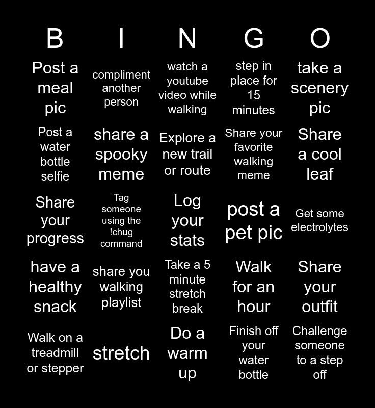 This bingo card has a free space and 24 words: share you walking playlist, stretch, Explore a new trail or route, Walk on a treadmill or stepper, take a scenery pic, Post a meal pic, Post a water bottle selfie, compliment another person, post a pet pic, Take a 5 minute stretch break, Share your favorite walking meme, Share your progress, Walk for an hour, Share your outfit, share a spooky meme, Finish off your water bottle, Get some electrolytes, watch a youtube video while walking, Share a cool leaf, Tag someone using the !chug command, Challenge someone to a step off, have a healthy snack, step in place for 15 minutes and Do a warm up.