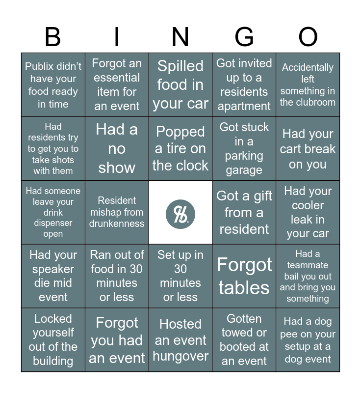 This bingo card has a free space and 34 words: Hosted 2 events on the same day, Gotten towed or booted at an event, Broke an entire crate of glassware, Had your cart topple over, Had your speaker die mid event, Had a no show, Accidentally left something in the clubroom, Locked yourself out of the building, Forgot an essential item for an event, Had to sing karaoke to elevate the mood, Popped a tire on the clock, Spilled food in your car, Got stuck in an elevator, Hosted a grand opening, Got a gift from a resident, Had your cart break on you, Forgot you had an event, Had someone leave your drink dispenser open, Ran out of food in 30 minutes or less, Forgot tables, Set up in 30 minutes or less, Had a resident flirt with you, Publix didn’t have your food ready in time, Had your cooler leak in your car, Hosted an event hungover, Had a dog pee on your setup at a dog event, Got invited up to a residents apartment, Forgot your clothes or shoes at the hub, Got stuck in a parking garage, Had residents try to get you to take shots with them, Had residents help themselves to your bins, Resident mishap from drunkenness, Had a teammate bail you out and bring you something and Had a broken tent for a pool party.