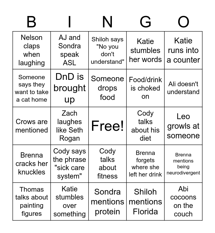 This bingo card has a free space and 43 words: Abi flirts with Julie, Abi cocoons on the couch, Abi talks in a baby voice, Thomas talks about painting figures, Shiloh says something unhinged, Shiloh mentions Florida, Shiloh says "No you don't understand", Katie makes a dirty joke, Katie runs into a counter, Katie stumbles over something, Katie stumbles her words, Cody talks about his diet, Cody talks about fitness, Cody says the phrase "sick care system", AJ makes "Hang Loose" gesture, Sondra mentions protein, Sondra brings crochet, Crows are mentioned, Ali strikes a pose, Ali doesn't understand, AJ and Sondra speak ASL, Someone compliments Ali's outfit, Nelson reads a sign, Nelson claps when laughing, Nelson says "Incredible", Leo growls at someone, Leo gets put in timeout, Brenna loses her phone, Brenna forgets where she left her drink, Brenna cracks her knuckles, Brenna talks with her hands, Brenna mentions being neurodivergent, Brenna forgets what something is called, Zach laughes like Seth Rogan, Zach mentiones Miluakee tools, Zach mentions Wisonsin, Someone spills a drink, Someone drops food, Someone says they want to take a cat home, Food/drink is choked on, Height is talked about, DnD is brought up and Someone doesn't know what DnD is.
