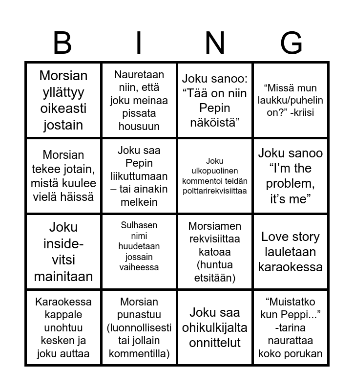 This bingo card has 16 words: Morsian punastuu (luonnollisesti tai jollain kommentilla), Love story lauletaan karaokessa, Joku sanoo: “Tää on niin Pepin näköistä”, Morsian yllättyy oikeasti jostain, Joku inside-vitsi mainitaan, Nauretaan niin, että joku meinaa pissata housuun, Morsiamen rekvisiittaa katoaa (huntua etsitään), Joku saa ohikulkijalta onnittelut, Morsian tekee jotain, mistä kuulee vielä häissä, Joku saa Pepin liikuttumaan – tai ainakin melkein, Karaokessa kappale unohtuu kesken ja joku auttaa, “Missä mun laukku/puhelin on?” -kriisi, Sulhasen nimi huudetaan jossain vaiheessa, Joku sanoo “I’m the problem, it’s me”, Joku ulkopuolinen kommentoi teidän polttarirekvisiittaa and “Muistatko kun Peppi...” -tarina naurattaa koko porukan.