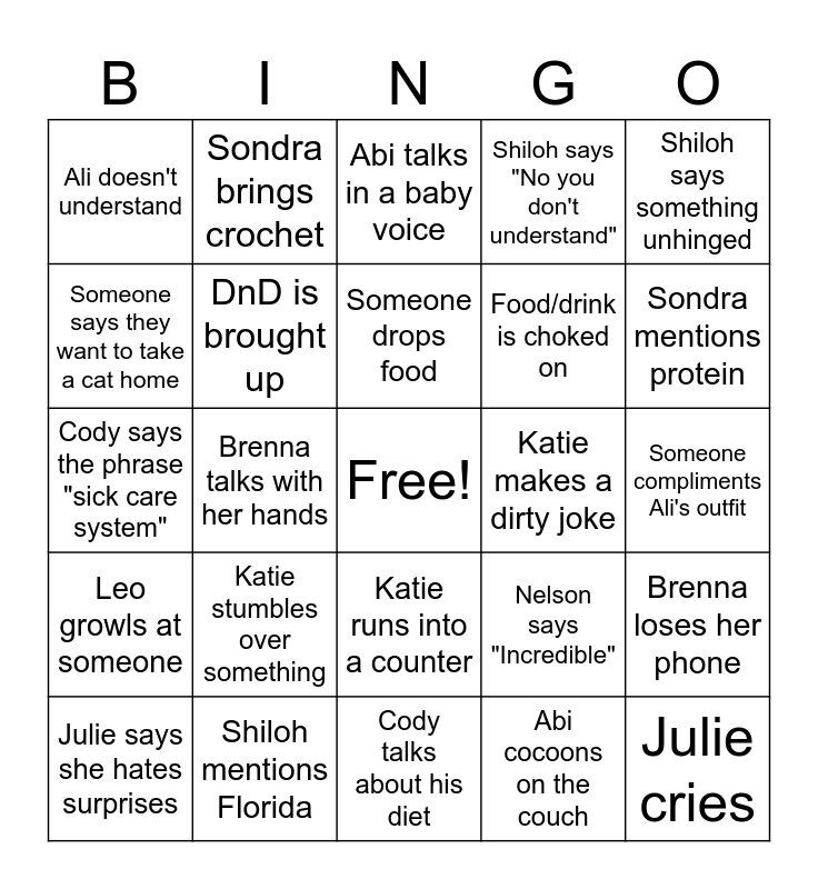 This bingo card has a free space and 44 words: Julie snorts, Julie cries, Julie makes a diabetes joke, Julie says she hates surprises, Abi flirts with Julie, Abi cocoons on the couch, Abi talks in a baby voice, Thomas talks about painting figures, Shiloh says something unhinged, Shiloh mentions Florida, Shiloh says "No you don't understand", Katie makes a dirty joke, Katie runs into a counter, Katie stumbles over something, Katie stumbles her words, Cody talks about his diet, Cody talks about fitness, Cody says the phrase "sick care system", AJ makes "Hang Loose" gesture, Sondra mentions protein, Sondra brings crochet, Crows are mentioned, Ali strikes a pose, Ali doesn't understand, AJ and Sondra speak ASL, Someone compliments Ali's outfit, Nelson reads a sign, Nelson claps when laughing, Nelson says "Incredible", Leo growls at someone, Leo gets put in timeout, Brenna loses her phone, Brenna forgets where she left her drink, Brenna cracks her knuckles, Brenna talks with her hands, Brenna mentions being neurodivergent, Brenna forgets what something is called, Someone spills a drink, Someone drops food, Someone says they want to take a cat home, Food/drink is choked on, Height is talked about, DnD is brought up and Someone doesn't know what DnD is.