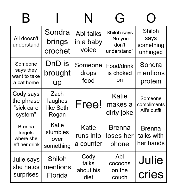 This bingo card has a free space and 44 words: Julie snorts, Julie cries, Julie makes a diabetes joke, Julie says she hates surprises, Abi flirts with Julie, Abi cocoons on the couch, Abi talks in a baby voice, Thomas talks about painting figures, Shiloh says something unhinged, Shiloh mentions Florida, Shiloh says "No you don't understand", Katie makes a dirty joke, Katie runs into a counter, Katie stumbles over something, Katie stumbles her words, Cody talks about his diet, Cody talks about fitness, Cody says the phrase "sick care system", AJ makes "Hang Loose" gesture, Sondra mentions protein, Sondra brings crochet, Crows are mentioned, Ali strikes a pose, Ali doesn't understand, AJ and Sondra speak ASL, Someone compliments Ali's outfit, Leo growls at someone, Leo gets put in timeout, Brenna loses her phone, Brenna forgets where she left her drink, Brenna cracks her knuckles, Brenna talks with her hands, Brenna mentions being neurodivergent, Brenna forgets what something is called, Zach laughes like Seth Rogan, Zach mentiones Miluakee tools, Zach mentions Wisonsin, Someone spills a drink, Someone drops food, Someone says they want to take a cat home, Food/drink is choked on, Height is talked about, DnD is brought up and Someone doesn't know what DnD is.