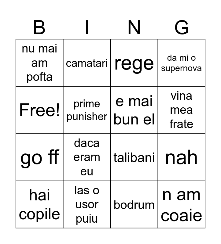 This bingo card has 16 words: las o usor puiu, nah, rege, nu mai am pofta, go ff, camatari, talibani, bodrum, Free!, prime punisher, hai copile, da mi o supernova, daca eram eu, vina mea frate, e mai bun el and n am coaie.
