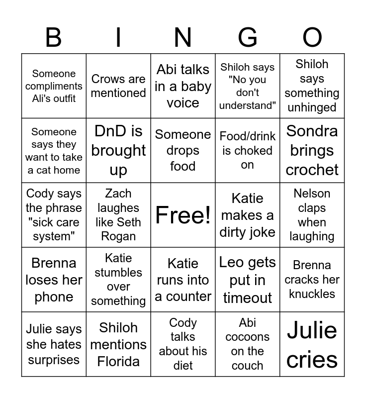 This bingo card has a free space and 45 words: Julie snorts, Julie cries, Julie makes a diabetes joke, Julie says she hates surprises, Abi flirts with Julie, Abi cocoons on the couch, Abi talks in a baby voice, Thomas talks about painting figures, Shiloh says something unhinged, Shiloh mentions Florida, Shiloh says "No you don't understand", Katie makes a dirty joke, Katie runs into a counter, Katie stumbles over something, Katie stumbles her words, Cody talks about his diet, Cody talks about fitness, Cody says the phrase "sick care system", Sondra mentions protein, Sondra brings crochet, Crows are mentioned, Ali strikes a pose, Ali doesn't understand, Someone compliments Ali's outfit, Nelson reads a sign, Nelson claps when laughing, Nelson says "Incredible", Leo growls at someone, Leo gets put in timeout, Brenna loses her phone, Brenna forgets where she left her drink, Brenna cracks her knuckles, Brenna talks with her hands, Brenna mentions being neurodivergent, Brenna forgets what something is called, Zach laughes like Seth Rogan, Zach mentiones Miluakee tools, Zach mentions Wisonsin, Someone spills a drink, Someone drops food, Someone says they want to take a cat home, Food/drink is choked on, Height is talked about, DnD is brought up and Someone doesn't know what DnD is.
