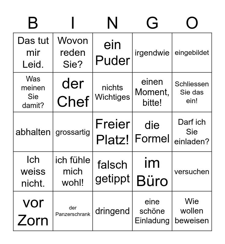 This bingo card has a free space and 27 words: im Büro, erreichen, einen Moment, bitte!, dringend, Was meinen Sie damit?, ein Puder, Wovon reden Sie?, Ich weiss nicht., die Formel, versuchen, abhalten, irgendwie, vor Zorn, der Panzerschrank, Schliessen Sie das ein!, etwas früher, der Chef, nichts Wichtiges, ich fühle mich wohl!, Das tut mir Leid., Darf ich Sie einladen?, eine schöne Einladung, grossartig, Wie wollen beweisen, falsch getippt, eingebildet and neugerig.
