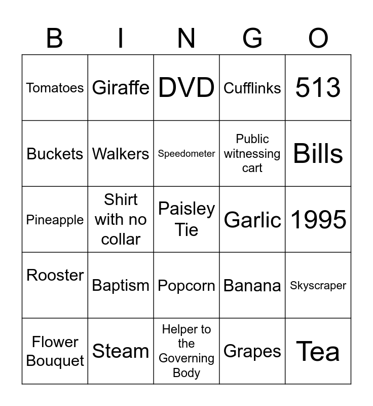 This bingo card has 37 words: Free!, Grapes, Handcuffs, Walkers, Skyscraper, Baptism, Speedometer, Yellow Star, 513, Necklace, Shirt with no collar, Cufflinks, Paisley Tie, 1995, Buckets, Rooster, Australia, DVD, Popcorn, Garlic, Tomatoes, Bills, Flower Bouquet, Helper to the Governing Body, Water hose, Grapes, Giraffe, Headphones, Swings, White wine, Cattle, Steam, Pineapple, Tea, Banana, Public witnessing cart and Fishing Pole.
