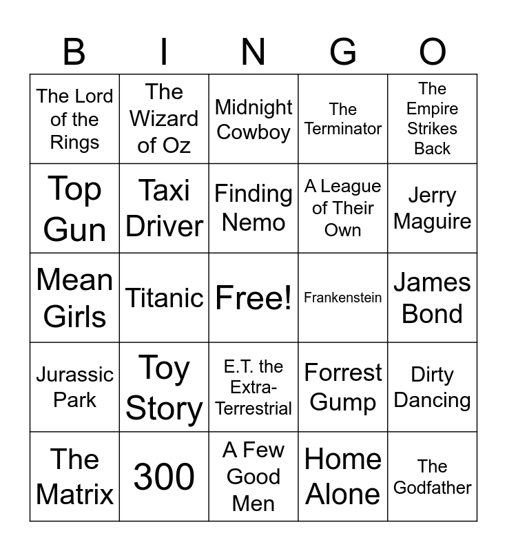 This bingo card has a free space and 50 words: Star Wars, The Godfather, Casablanca, A Few Good Men, Toy Story, The Sixth Sense, The Wizard of Oz, Apollo 13, Top Gun, The Dark Knight, Taxi Driver, The Terminator, Dirty Dancing, Forrest Gump, Poltergeist, Jaws, Finding Nemo, Frankenstein, Scarface, The Empire Strikes Back, Titanic, Home Alone, The Lord of the Rings, A League of Their Own, There Will Be Blood, Black Panther, Jerry Maguire, The Shining, Midnight Cowboy, E.T. the Extra-Terrestrial, Clueless, Jerry Maguire, The Hunger Games, Babe, 300, Love Actually, Avatar, The Wizard of Oz, Gone with the Wind, James Bond, Iron Man, Toy Story, Harry Potter, Evil Dead, The Matrix, Mean Girls, Kindergarten Cop, Airplane!, Jurassic Park and The Room.