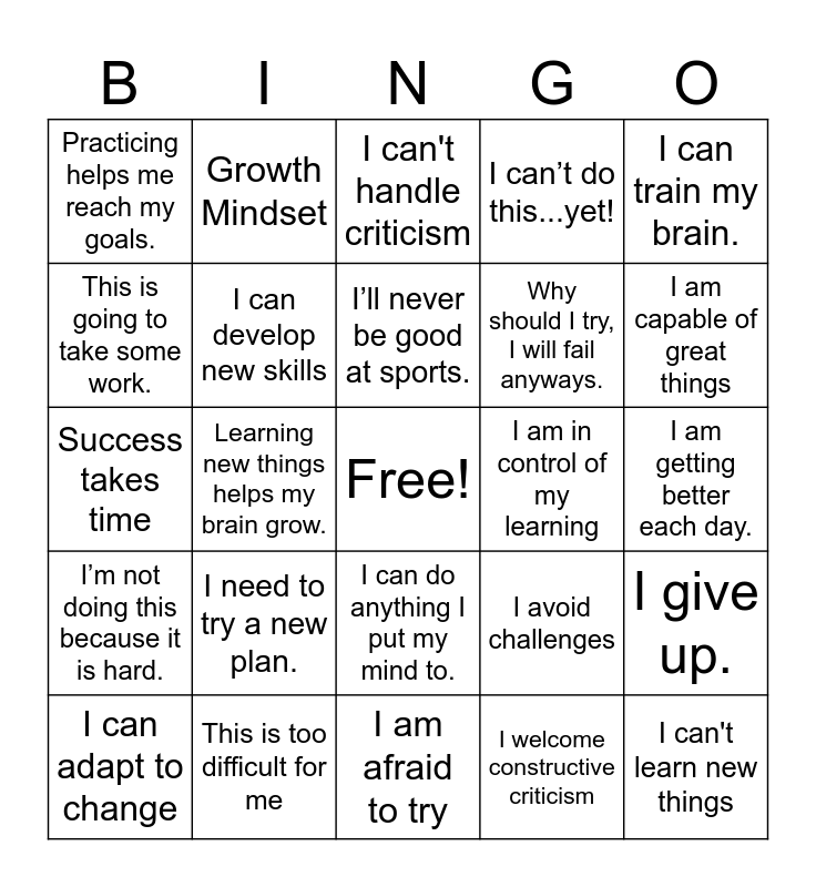 This bingo card has a free space and 63 words: Fixed Mindset, I will keep trying., I am horrible at this., I give up., I can do this., This is too hard., Growth Mindset, Mistakes help me learn., I’ll never be good at sports., Goal setting helps challenge me., I can do anything I put my mind to., Goals help me grow., I am getting better each day., I can train my brain., A fixed mindset will not help my brain grow., This is going to take some work., Learning new things helps my brain grow., Practicing helps me reach my goals., I can do this if I keep trying., Why should I try, I will fail anyways., I need to try a new plan., I’m not doing this because it is hard., I can’t do this...yet!, I believe in myself., Challenges are opportunities, I embrace feedback, I am a lifelong learner, Every mistake is a lesson, Progress over perfection, I can improve with practice, I can learn anything, I will keep pushing myself, I seek challenges, My efforts will pay off, I am capable of great things, I can adapt to change, Growth is a journey, I welcome constructive criticism, I will not be afraid to fail, I can develop new skills, Success takes time, I am in control of my learning, I am proud of my efforts, I'm just not good at this, I can't learn new things, This is too difficult for me, I don't want to look stupid, I avoid challenges, I will never improve, I am not a math person, I can't change my abilities, I am afraid to try, I don't want to fail, It's too late for me to learn, I don't see the point in trying, I can't handle criticism, I give up too easily, I'm not smart enough, I prefer to stick to what I know, I let fear stop me, I can't compete with others, I don't believe I can change and I feel overwhelmed by challenges.