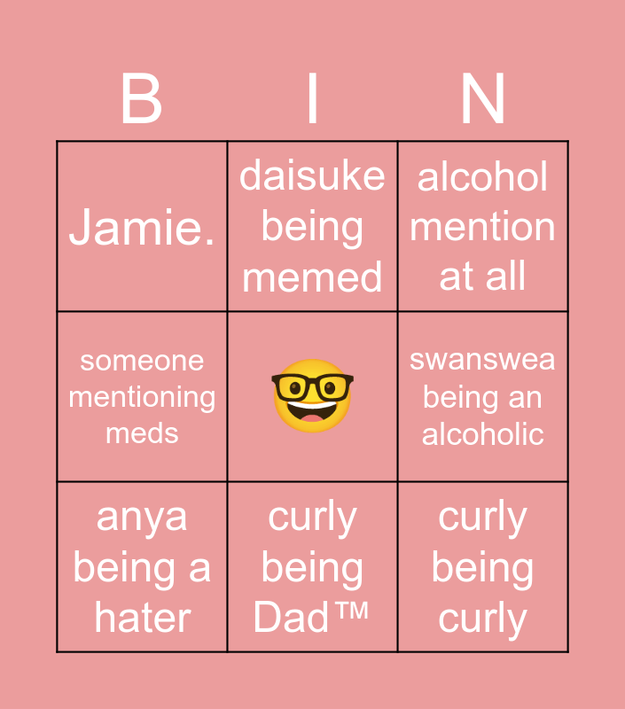This bingo card has a free space and 8 words: swanswea being an alcoholic, alcohol mention at all, daisuke being memed, anya being a hater, Jamie., curly being curly, someone mentioning meds and curly being Dad™.