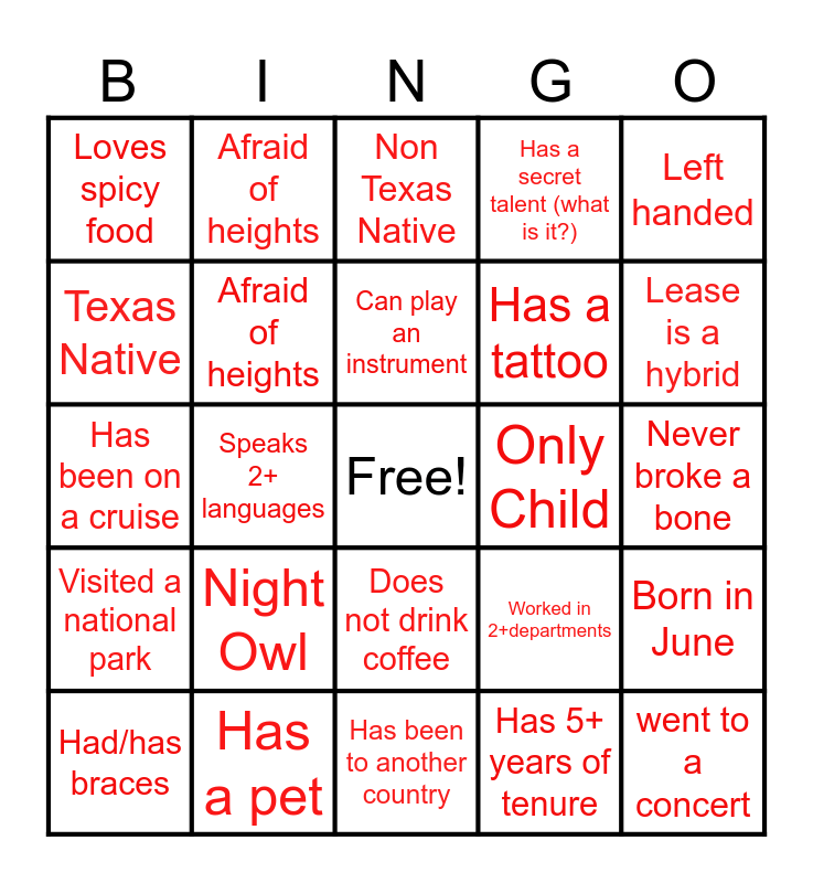 This bingo card has a free space and 25 words: Night Owl, Has been to another country, Can play an instrument, Had/has braces, Left handed, Loves spicy food, Texas Native, Afraid of heights, Only Child, Does not drink coffee, Has a tattoo, Has been on a cruise, Worked in 2+departments, Born in June, Afraid of heights, Has 5+ years of tenure, Never broke a bone, Non Texas Native, Lease is a hybrid, Speaks 2+ languages, went to a concert, Has a pet, Visited a national park, Has a secret talent (what is it?) and Has 5+ years of tenure.