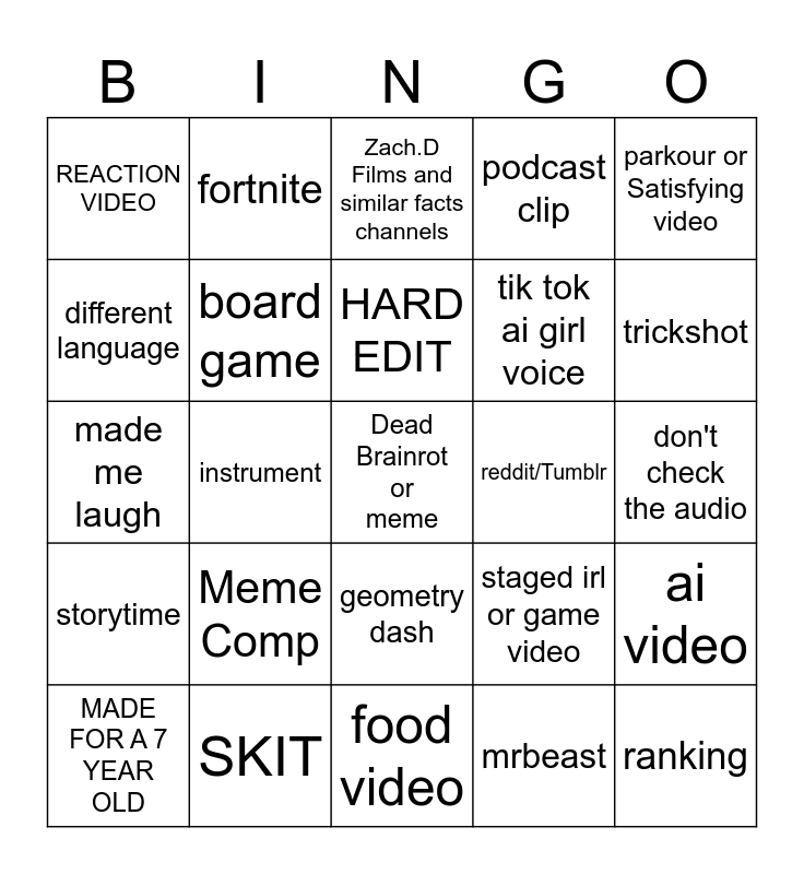 This bingo card has a free space and 24 words: Meme Comp, SKIT, HARD EDIT, MADE FOR A 7 YEAR OLD, parkour or Satisfying video, REACTION VIDEO, different language, fortnite, reddit/Tumblr, geometry dash, tik tok ai girl voice, made me laugh, staged irl or game video, ai video, board game, mrbeast, don't check the audio, Zach.D Films and similar facts channels, trickshot, instrument, ranking, storytime, podcast clip and food video.
