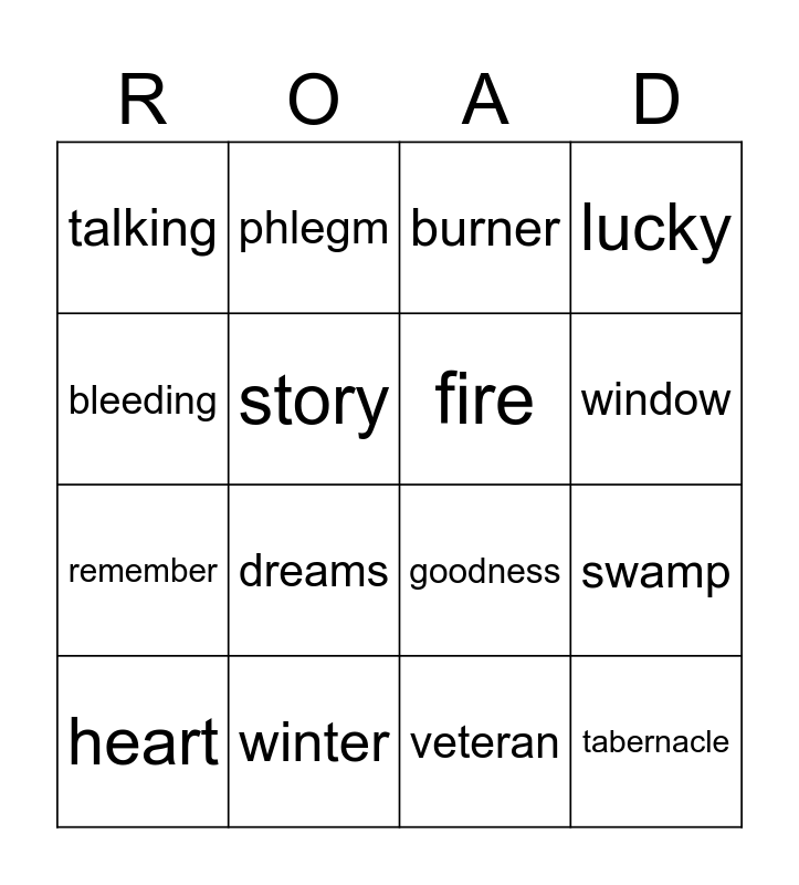 This bingo card has 25 words: Free!, worry, window, disinfected, bleeding, talking, story, phlegm, winter, road, remember, goodness, light, rain, fire, ash, veteran, burner, dreams, swamp, heart, brave, tabernacle, lucky and south.